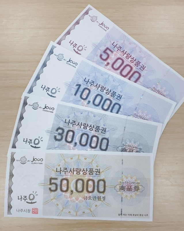 전라남도 나주시(시장 강인규)는 지역 자본의 역외유출 방지와 민생경제 활성화를 위해 나주사랑상품권 구매액 기준 10%할인 판매를 오는 6월까지 유지한다고 26일 밝혔다.