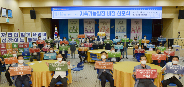 광주 서구(구청장 서대석)는 지난 26일 서구 18개 동 주민대표, 사회단체 임원, 기업대표, 전문가 등 50여 명이 참석한 가운데 지속가능발전 2030 비전 선포식을 개최했다.