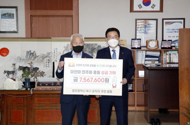 2일 광주시 북구(구청장 문인)에 따르면 군부의 폭압에 항거하는 미얀마 국민들을 지지하기 위해 757만원의 성금을 ‘미얀마 광주연대’에 기탁했다.