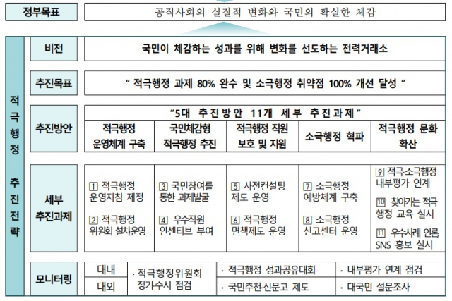 반면 소극행정 신고센터 운영과 현장점검 등을 통해 업무 지연처리, 규제 남용 등에 대해서는 내부평가와 연계해 조치한다는 방침으로 소극행정을 철저히 예방하고 혁파할 것을 밝혔다.