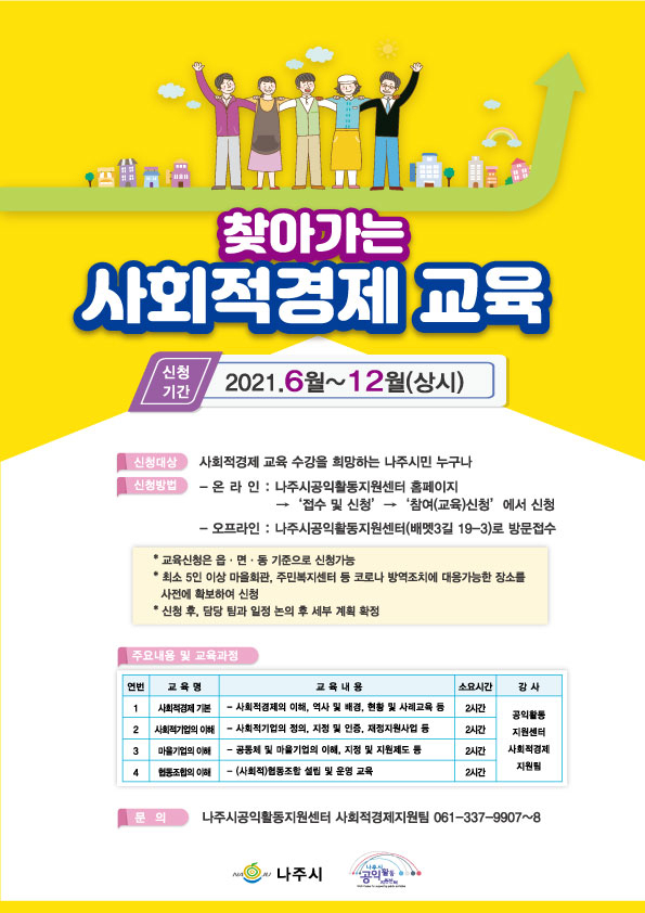 전라남도 나주시(시장 강인규)는 사회적 경제에 대한 지역사회 인식 제고와 교육 접근성 향상을 목표로 ‘2021년 찾아가는 사회적경제 교육’ 신청팀을 연중 상시 모집한다고 24일 밝혔다.