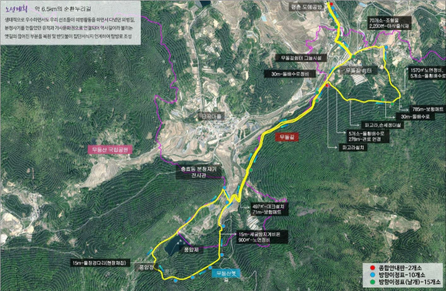 또 이 지역에서 서식하는 수달과 노란목도리담비 등 멸종위기종과 청정한 지역에서만 볼 수 있는 반딧불이의 생육환경을 고려해 생태적 환경을 고려한 친자연형 누리길을 조성한다는 계획이다.
