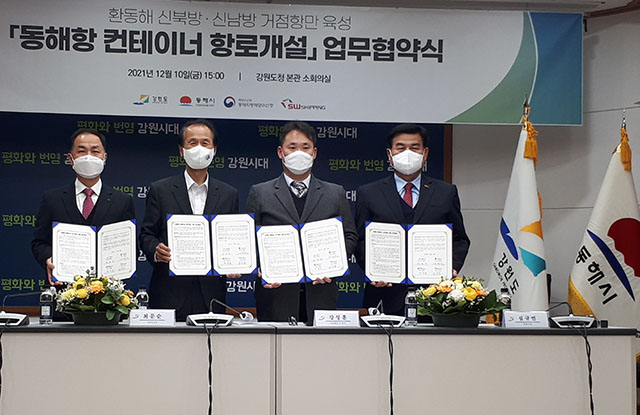 동해시(시장 심규언)는 10일, 강원도청 본관2층 소회의실에서 ‘동해·묵호항을 모항으로 하는 동해항 컨테이너 항로개설 업무협약’을 체결했다.