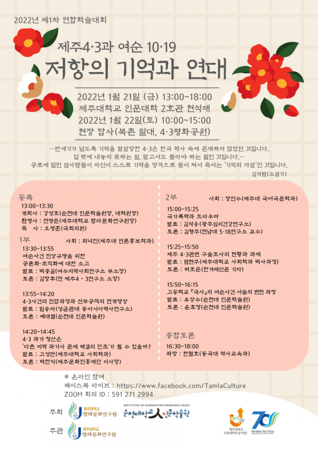 순천대학교(총장 고영진) 인문학술원이 오는 21일 제주대학교 탐라문화연구원과 공동으로 제주대학교 인문대학 2호관 현석재에서 여순사건특별법 통과를 맞이하여 ‘제주4·3과 여순 10·19 저항과 기억의 연대’를 주제로 학술대회를 진행한다.