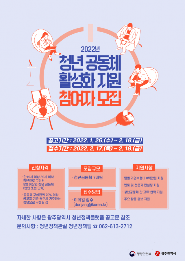광주광역시는 공동체를 통해 청년과 청년을 잇고, 청년과 지역을 연결할 ‘2022년 청년공동체 활성화 사업’ 참여자를 공모한다.