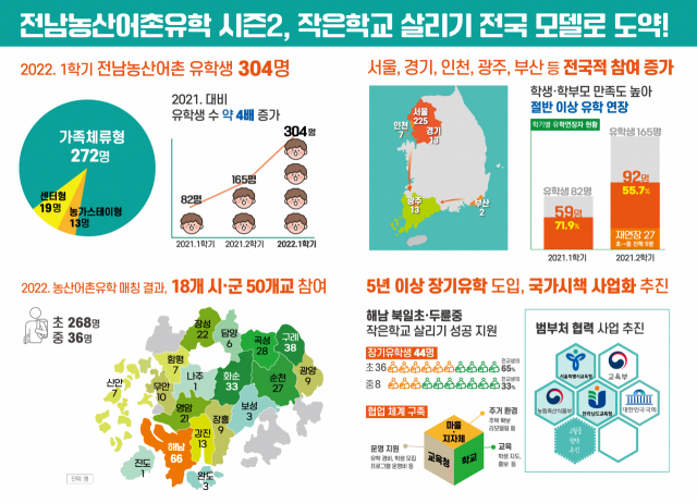 전남교육청은 지난 1년간의 성과와 경험을 바탕으로 2022년부터는 ‘전남농산어촌유학 시즌 2’를 시작한다. 생활인구 유입형인 단기유학과 정주형 장기유학을 활성화하고, 범부처 연계 국가시책사업으로 확대하는 것이 그 핵심이다.