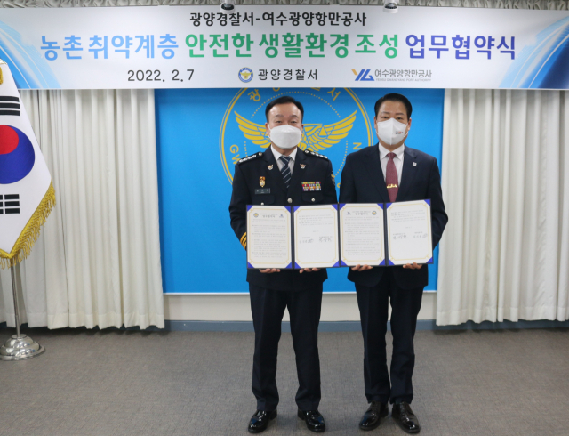 여수광양항만공사(사장 박성현)는 7일 광양경찰서(서장 장진영)와 농촌 취약계층 보호를 위한 치안인프라 구축 업무협약을 체결했다고 밝혔다.