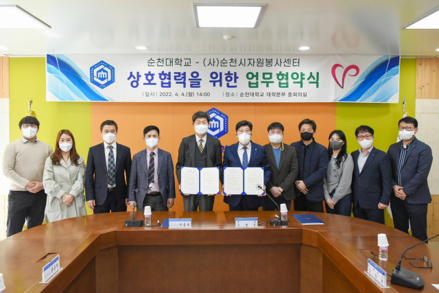 순천대학교와 (사)순천시 자원봉사센터가 업무협약을 맺고 대학생들의 자원봉사 활동을 지원하고 나눔문화 확산을 위한 새로운 프로그램을 기획하는 등에 함께 하기로 하였다.