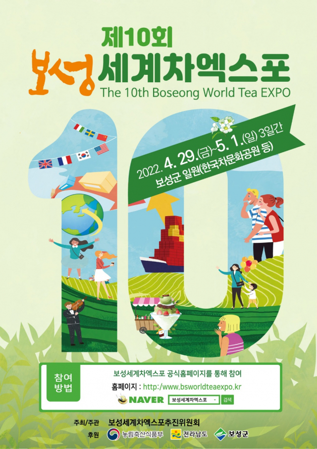 보성군은 오는 4월 29일부터 5월 1일까지 ‘2022. 제10회 보성세계차엑스포’를 ‘대한민국 녹차수도 보성, 세계로! 미래로!’라는 주제로 한국차문화공원과 관내 체험 다원, 공식 홈페이지를 통해 3일간 개최한다.