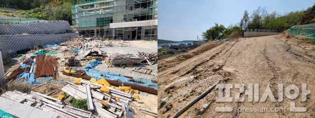 또한 공사를 중단하면서 비가 오면 토사 유출로 이어지고 있으며 방치된 철근과 폐기물이 흉가를 방불케하고 있다.