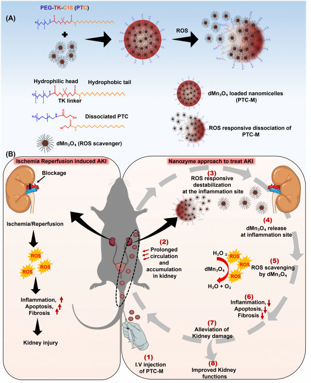 특히 염증감지기능이 있는 특수 제작한 마이셀이 혈액 속에 존재하다가 급성 신손상시 발생한 염증부위의 활성산소에 반응하여 분해됨으로서 마이셀에 담지된 산화망간 입자를 염증부위에 방출하여 활성산소를 산소로 분해시키는 원리를 이용했다.