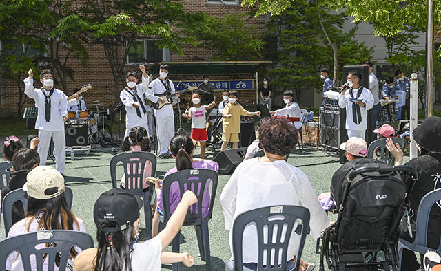 빅밴드로 연주팀을 구성한 1함대 군악대는 ‘어린이날 노래’, ‘아기상어’, ‘아빠! 힘내세요!’ 등 어린이들이 함께 부를 수 있는 경쾌한 음악과 대중가요 등 다양한 장르의 연주와 노래로 1시간가량 진행되었다.