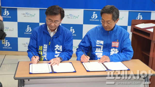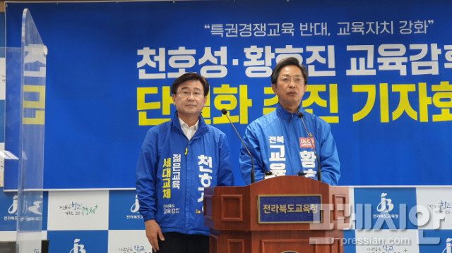 천호성·황호진 전북교육감 예비후보가 후보 단일화에 합의하고 오는 13일까지 여론조사 방식을 통해 단일후보를 선출하기로했다.