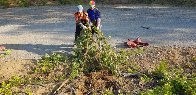덩굴제거 방법은 칡이나 다른 덩굴류가 조림목을 감아 올라가지 못하도록 뿌리를 굴취하거나, 비닐랩으로 밀봉하여 뿌리가 썩도록 유도하는 작업으로 사용된 비닐랩은 시간이 지나면 분해되는 친환경적인 방법이다.