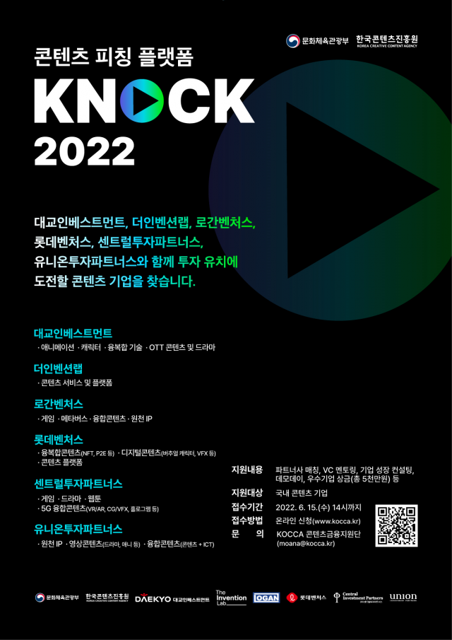 ‘케이녹’은 콘텐츠 기업과 투자자를 연결해 기업의 자금 확보와 성장을 지원하는 콘진원의 대표 투자유치 지원 프로그램이다. 올해는 대교인베스트먼트, 더인벤션랩, 로간벤처스, 롯데벤처스, 센트럴투자파트너스, 유니온투자파트너스 등 6개 투자사와‘케이녹 파트너스’ 체계를 구축하여 유망 K-콘텐츠 발굴에 함께 나선다.