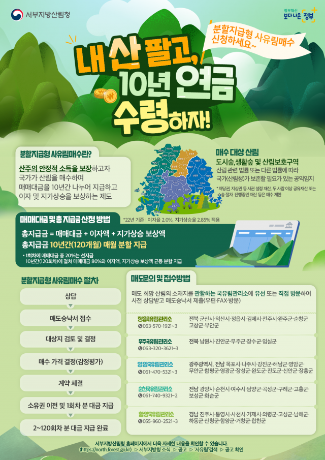 ‘분할지급형 사유림 매수제도’는 매매대금을 일시에 지급하는 기존 사유림 매수제도와 달리 매매대금을 10년간(126개월) 월 단위로 나눠 연금처럼 지급하는 제도로 올해 순천국유림관리소에서는 전년 대비 2배 이상 예산을 확보하여 97ha의 사유림을 매수할 계획이다.