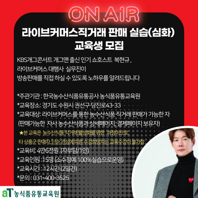 본 과정은 라이브커머스 방송을 통해 자사의 농수산식품을 직접 방송 판매할 수 있는 실무 역량 강화를 목표로 하며, KBS 개그콘서트 출신 인기 쇼호스트 복현규씨도 강사로 참여할 예정이다.