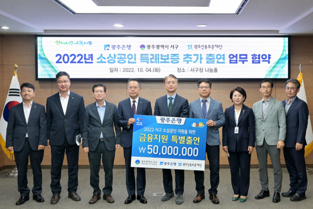 서구에 따르면 오늘(지난 4일) 김이강 서구청장과 송종욱 광주은행장, 이안묵 광주신용보증재단 경영지원본부장 등이 참석한 가운데 ‘소상공인 특례보증을 위한 출연금 추가지원 협약’을 체결했다.