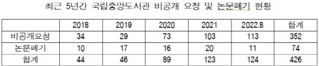 7일 국회 문화체육관광위원회 김윤덕 의원이 국립중앙도서관으로부터 제출 받은 ‘최근 5년간 비공개 요청 및 논문폐기 현황’을 보면 지난 2018년 34건, 2019년 29건에 머물된 비공개요청이 2020년 73건, 2021년 103건으로 급증했다.