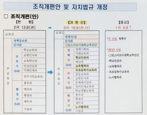 학교교육과는 유초등특수교육과·중등교육과로 분리되고 공사립학교의 체계적 관리를 위한 사학팀이 신설된다. 이 외에도 안전과 노사전담, 그린스마트미래학교추진단(한시기구)등의 전담부서도 새로 만든다.