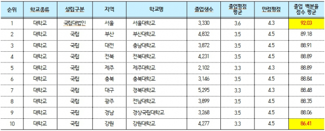 서울대를 제외한 거점 국립대학 중에서는 지난해 부산대 졸업생 평균점수가 89.18점으로 가장 높았다. 충남대가 88.91점이었고, 전북대와 제주대가 88.89점으로 그 뒤를 이었다. 평균점수가 가장 낮은 대학은 강원대로 86.41을 기록했다. 경상대와 전남대도 각각 88.06점과 88.35점으로 낮은 수치를 보였다.