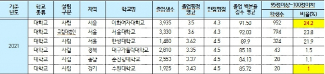 이화여대 95점 이상 24.2%, 수원대는 1% ...거점 국립대 상대평가 비율 경북대 95.3%, 전북대 20.4%