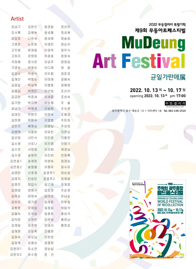 임택 동구청장은 “무등아트페스티벌은 문화관광도시 동구에서 지역 예술가들의 수준 높은 작품을 합리적인 가격으로 구입할 수 있는 절호의 기회”라면서 “충장 월드페스티벌 기간 중 열리는 판매전에 많은 분들이 오셔서 지역 예술 시장에 활력을 불어넣고 예술인들을 응원하는 시간이 되길 바란다”고 말했다.