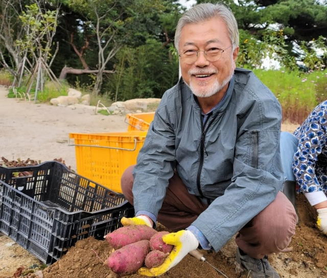문재인 전 대통령이 부인 김정숙 씨와 함께 고구마, 호박 등을 수확하는 모습을 SNS에 올려 근황을 전했다.
