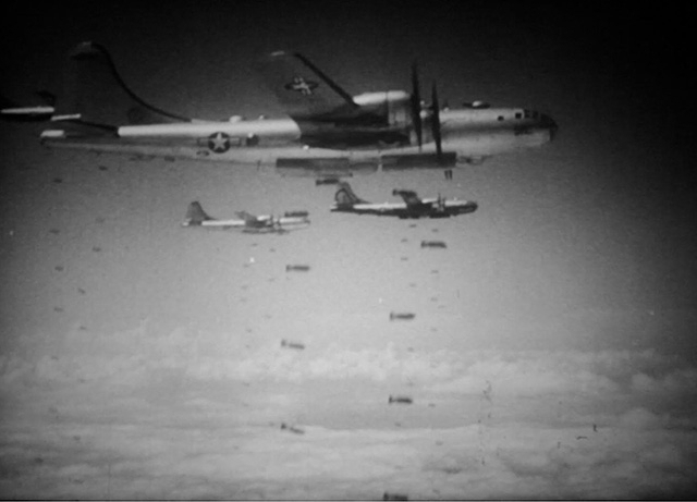 ▲한국전쟁 당시 미국 전투기가 포탄을 떨어뜨리고 있다. ⓒ<초토화작전> 갈무리