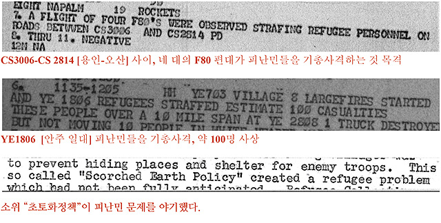 이는 ‘초토화작전’에서 “피난민 가운데 공산당원이나 북한국으로 위장해 자신들의 후방을 노린다고 판단해 이같은 작전을 벌였다는 미군의 기록과 증언”과 일치하는 것이며 ’한국전쟁사‘ 3권에 기록된 미 제5공군의 주요 교통로를 파괴해 후방을 차단하는 임무와 일치하는 것이다.