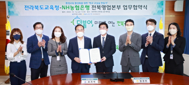 서거석 전라북도교육감과 장경민 NH농협은행 전북본부장은 14일 도교육청 5층 회의실에서 학생중심 미래교육 실천을 위한 ‘교실 숲 조성’ 업무협약을 체결하고 양 기관은 기후위기와 환경문제의 심각성을 미래세대에 알리면서 학생들의 교육환경 개선을 위해 상호 적극 협력하기로 했다.