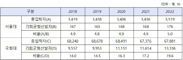 실제로 최근 5년간 서울대 기회균형선발 현황을 보면 서울대는 다른 국립대에 비해 기회균형선발인원이 현저하게 적었는데 2022년 서울대의 기회균형선발인원은 전체의 5%인 176명으로 다른 국립대학이 전체 모집인원의 19.6%를 모집하는 것과 큰 차이를 보인다.