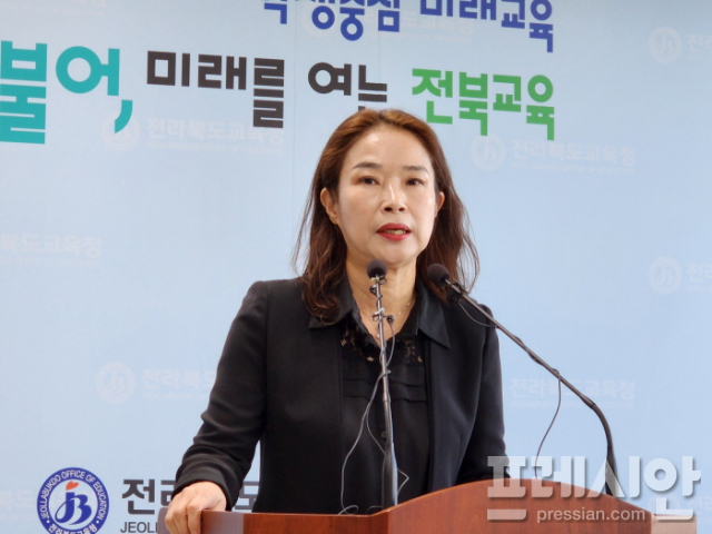 ▲19일 김숙 전북교육청 교육국장이 도교육청 브리핑룸에서 전북교육청의 '학력향상을 위한 학습지원 계획'을 발표하고 있다.  ⓒ프레시안