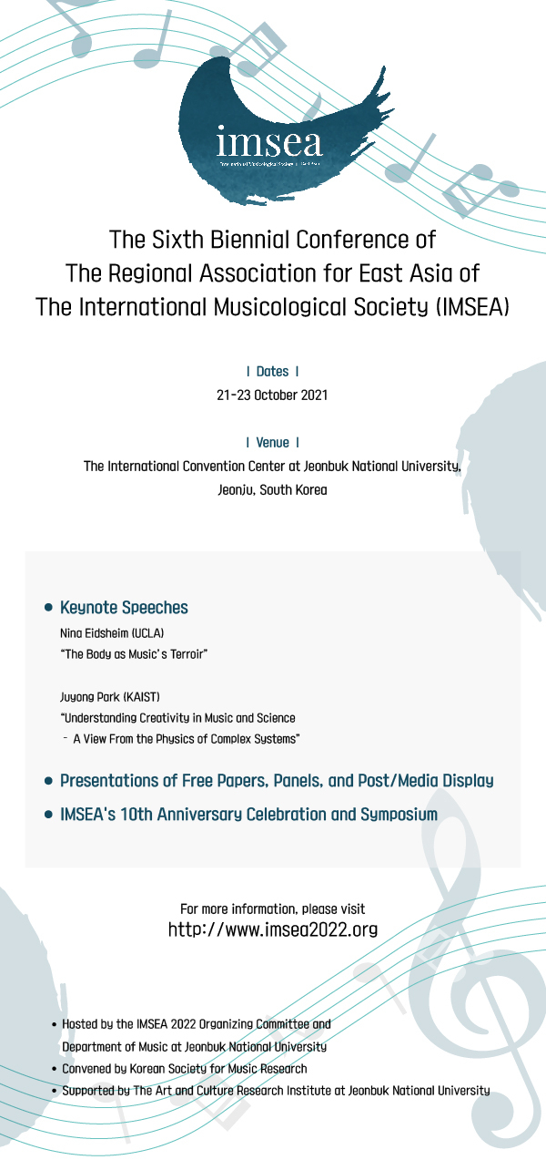 이번 국제학술대회는 2011년 9월 IMSEA가 한국에서 창립된 이후 11년 만에 다시 열리게 된 행사다. Kate van Orden IMS 회장(하버드대 교수)과 Laura Tunbridge IMS Directorium(옥스포드대 교수) 등 세계 10여개 국가에서 다양한 음악학자들이 참여해 60여 개의 논문 및 포스터가 발표될 예정이다.