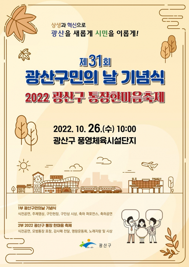 구는 26일 오전 10시 풍영체육시설단지에서 민선8기 구정목표인 ‘상생과 혁신으로 광산을 새롭게 시민을 이롭게!’를 슬로건으로 제31회 광산구민의날 기념식을 개최한다.