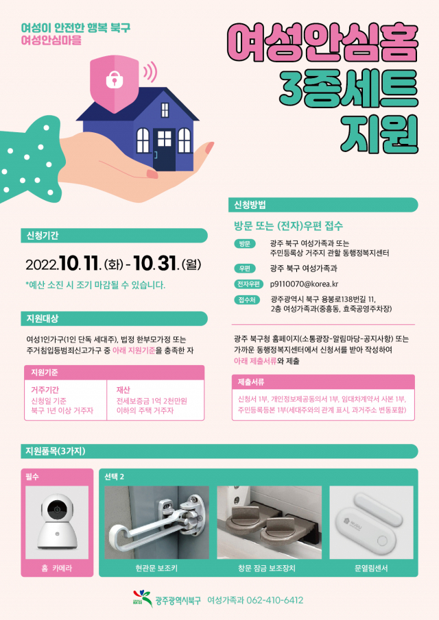 지원대상은 ▲여성 1인 가구 ▲한부모 가정 ▲주거침입 등 범죄신고 가구 등으로 180세대에 지원하며 북구에 1년 이상 거주 중인 전세보증금 1억 2000만원 이하의 주택 거주 세대만 신청 가능하다.