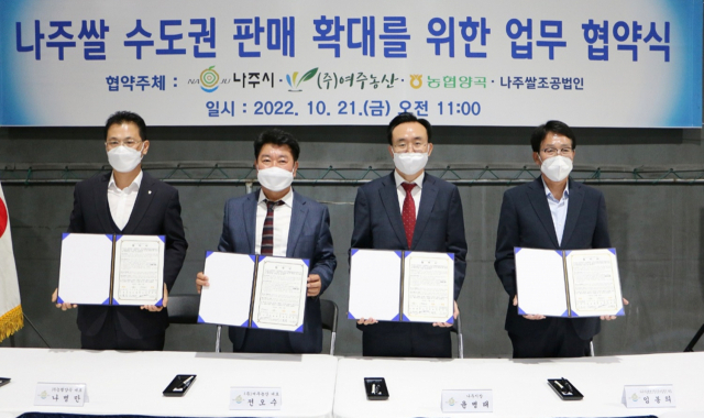 나주시(시장 윤병태)는 21일 경기도 시흥시 소재 국내 최대 곡물유통업체인 ㈜여주농산(대표 전오수)을 비롯한 ㈜농협양곡(대표 나병만), 나주시농협쌀조합공동사업법인(대표 임봉의)과 연 2만톤(t) 규모 ‘나주쌀 유통 활성화 협약’을 체결했다고 밝혔다.