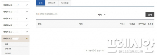 ▲26일 오후 2시 현재 전북대 총장 선거에 나선 일부 예비후보자의 자기소개란과 공약사항 ,영상자료란에 아무 것도 올려져 있지 않고 있다. ⓒ프레시안