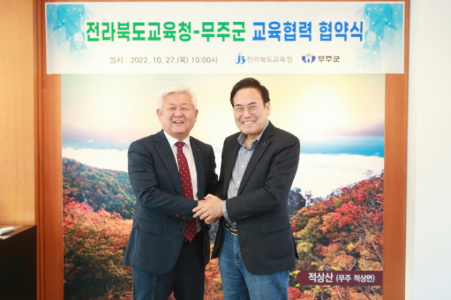 서거석 전라북도교육감과 황인홍 무주군수는 27일 무주군청에서 김승기 무주교육장과 무주군의회 부의장 등이 참석한 가운데 ‘전라북도교육청-무주군 교육협력’협약을 맺었다.