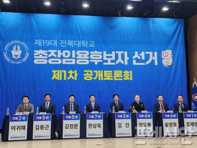 전북대학교 제19대 총장 임용후보자 선거를 앞두고 제1차 공개토론회가 후보 등록을 마친 8명의 후보자가 전원 참석한 가운데 열띤 분위기속에 열렸다.