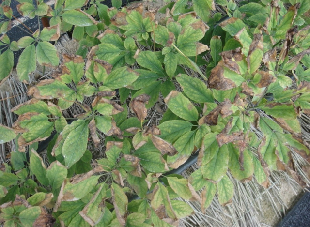 고온 피해를 본 인삼은 잎 가장자리부터 서서히 타들어 가다가 심하면 잎이 떨어지고 생장이 멈춘다.