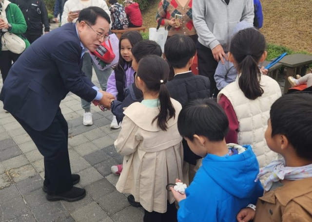 ▲정헌율 익산시장이 국화꽃 축제장을 찾은 아이들을 보고 환하게 웃으며 말을 건네고 있다. ⓒ익산시