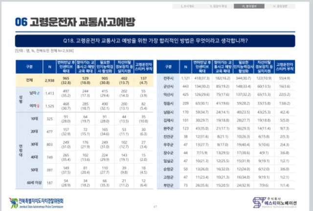 전북자치도민들은 고령운전자의 교통사고 예방을 위한 합리적인 방안에 대해 "면허 반납후 인센티브 확대"(32.8%)와 "필요한 인지능력 검사 활성화"(30.8) 등 두 가지의 견해를 보이는 것으로 분석됐다.