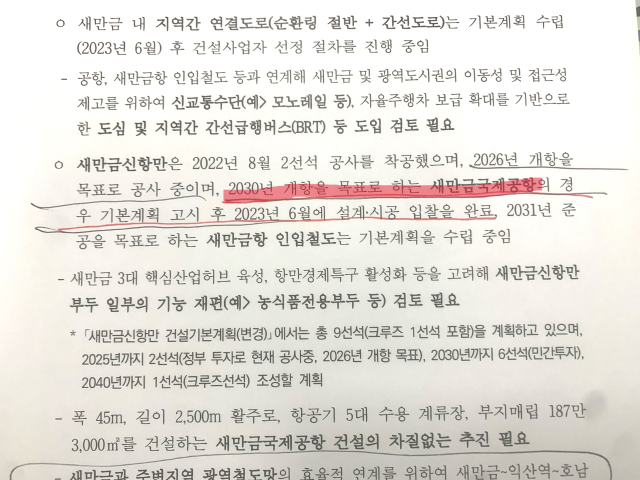 새만금 MP 재수립 용역은 기반시설 확충(8쪽)과 관련한 향후 계획에 대해 '새만금 국제공항의 경우 2030년 개항을 목표로 기본계획 고시 후 2023년 6월에 설계·시공 입찰을 완료한다'고 명시되어 있다.