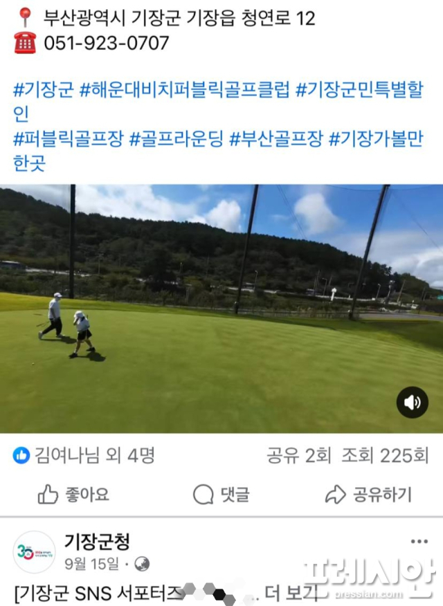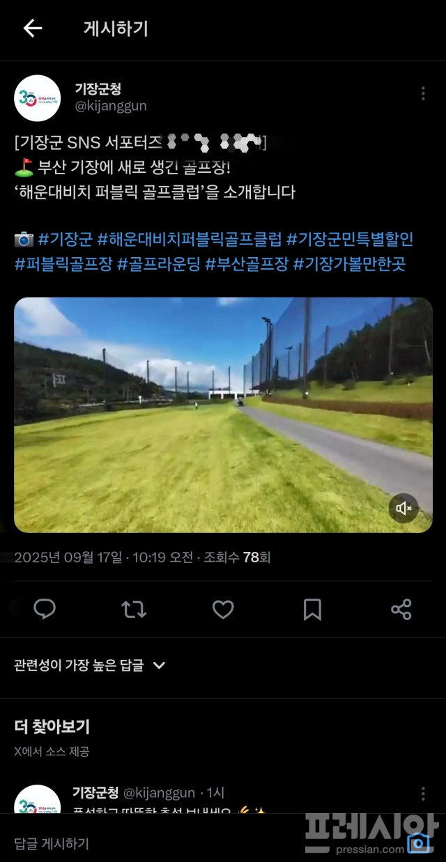 기장군청 공식X(옛 트위터) 계정에 따르면 지난 17일 오전 10시 19분 게시물에는 "부산 기장에 새로 생긴 골프장! 해운대 비치퍼블릭 골프클럽을 소개합니다"라는 문구와 함께 홍보 영상이 게재됐다. 게시물에는 기장군청 공식 해시태그와 함께 골프장 명칭이 반복적으로 노출됐다.