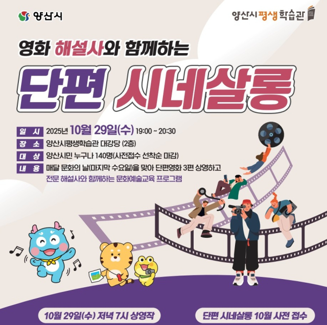 경남 양산시평생학습관은 매월 마지막 수요일께 ‘문화가 있는 날’을 맞아 단편영화 상영과 전문 해설이 어우러지는 문화예술교육 프로그램 '단편 시네살'을 운영한다고 10일 밝혔다.