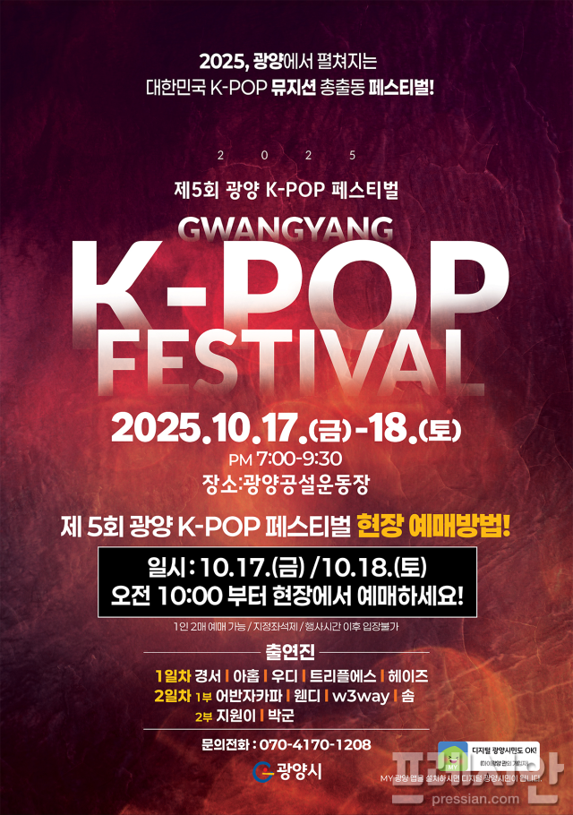 이현주 광양시 관광과장은 "기존의 탄탄한 최정상급 라인업에 신예 아티스트가 합류하면서 라인업이 더욱 풍성해졌다"며 "강렬한 퍼포먼스와 비주얼, 독창적인 음악 스타일로 특별한 감동을 선사할 제5회 광양 K-POP 페스티벌에 많은 관심과 성원을 바란다"고 말했다.