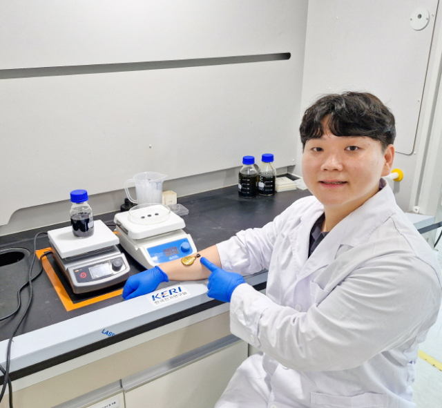 ▲힌국전기연구원 최명우 박사가 이번에 개발한 무선 센서를 자기 팔목에 부착하고 포즈를 취하고 있다. ⓒ한국전기연구원