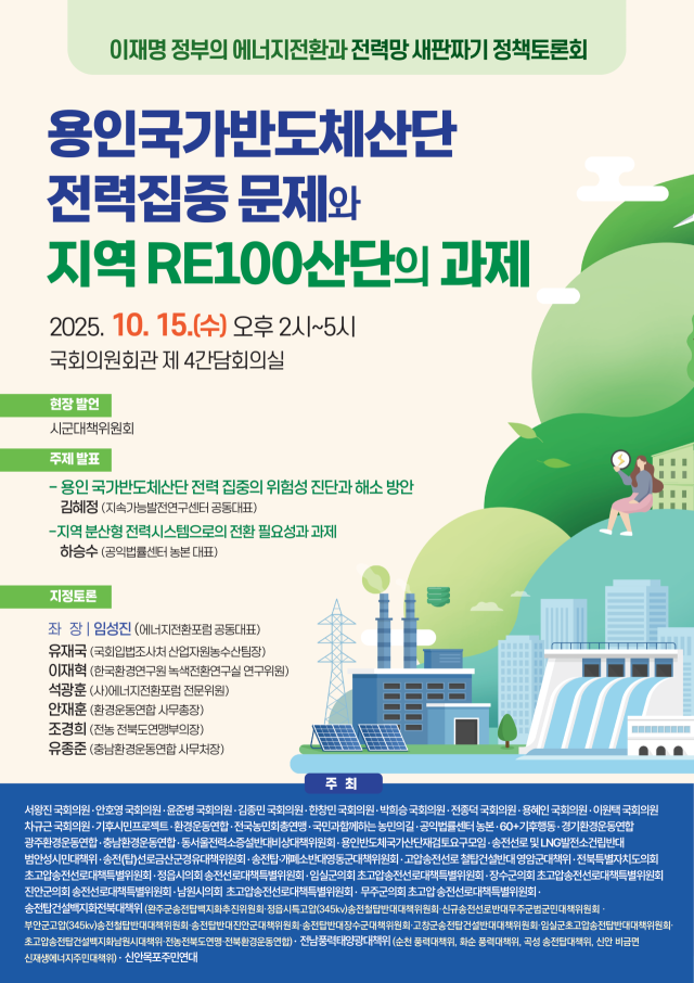 15일 오후 2시 국회의원회관 제 4간담회의실에서 열리는 이날 '용인 국가반도체산단 대규모 전력 집중 문제와 지역 RE100산단의 과제'정책토론회는 서왕진, 안호영, 윤준병, 이원택, 박희승, 김종민, 한창민, 전종덕, 용혜인, 차규근 국회의원과 환경운동연합, 전국농민회총연맹, 기후시민프로젝트, 공익법률센터 농본 등 기후 환경 농민 단체 및 전북, 충남, 전남, 경기도 송변전시설 지역대책위원회 등이 공동 주최한다.