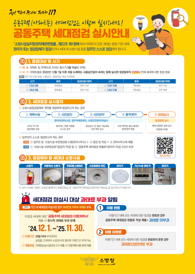 세대점검은 아파트 등 일정 규모 이상 공동주택 입주민이 세대 내 소방시설을 직접 확인하고 결과를 제출하는 제도로 점검을 하지 않으면 최대 300만 원 이하 과태료가 부과될 수 있다.